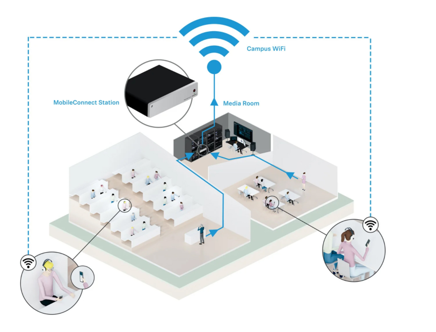 MobileConnect s'intègre en toute simplicité avec les infrastructures audio et réseau existantes. L'administration et la configuration du système sont un jeu d'enfant grâce au MobileConnect Manager. L'utilisateur peut désormais accéder au canal de son choix en saisissant l'identifiant associé ou en scannant un code QR. Il peut également transmettre du contenu audio vers n'importe quel smartphone (iOS et Android) grâce au Wi-Fi. Ce système est conçu pour offrir une solution d'écoute assistée totalement mobile, aux quatre coins du campus.