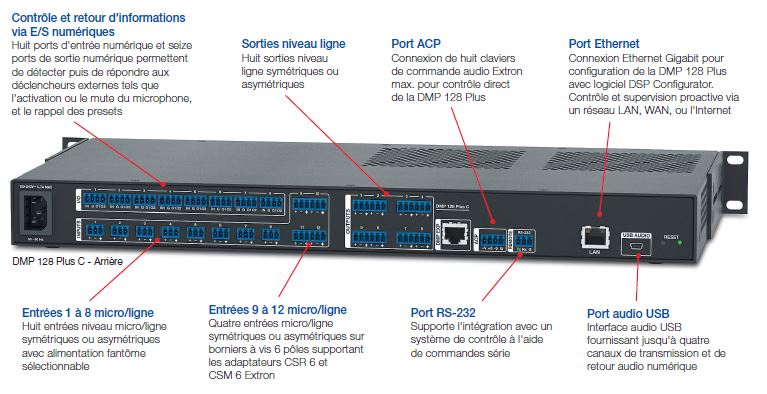 La gamme DMP 128 Plus est la nouvelle génération de matrices à processeur numérique intégrant la technologie en virgule flottante 64 bits ProDSP™ Extron. Les modèles de la gamme DMP 128 Plus sont équipés de douze entrées micro/ligne mono analogiques, de huit sorties analogiques, de quatre canaux d'entrée et de sortie audio numérique via USB maximum, de huit lecteurs de fichiers audio maximum, d'un bus ACP pour des claviers de commande audio et de nouvelles macros configurables. Les modèles V disposent par ailleurs de huit canaux indépendants VoIP maximum, supportant le protocole SIP 2.0 (Session Initiation Protocol). Les modèles AT offrent la technologie réseau audio Dante® avec une connectivité pour un maximum de 48 entrées audio numériques et 24 sorties audio numériques. La série de processeurs DMP 128 Plus peut être utilisée partout : dans un mobilier audiovisuel jusqu'à un système composé de plusieurs baies audiovisuelles, et même dans un large système complexe de bâtiments décentralisés. Aussi disponible : Dante, AEC, AEC & Dante, AEC & VoIP et AEC, VoIP & Dante