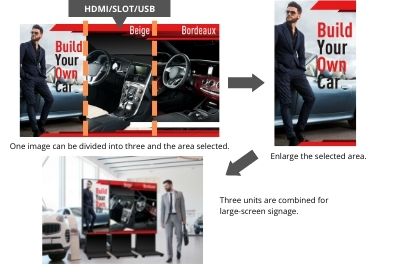 Disponible de 43 à 86 pouces pour s’adapter à votre espace, allant des petites salles de réunion à l’écran principal d’une salle de conférence. Il peut être installé horizontalement ou verticalement, ce qui vous permet de choisir l’orientation de l’installation en fonction du contenu. Il prend également en charge l’installation avec une inclinaison avant / arrière allant jusqu’à 20 degrés. Ainsi, il peut être fixé au mur ou incliné au bon angle de vision. Splittez le contenu à partir de sources d’image et agrandissez l’affichage dans une orientation portrait. Il n’est pas nécessaire d’utiliser un périphérique spécial, tel qu’un processeur, lors de la création de contenu à partir de diverses images. Placer trois modèles TH-65EQ2 verticalement crée un écran équivalent à 112 pouces. Cela permet une signalisation de magasin très visible.