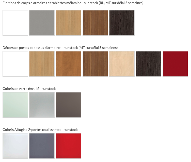 • 5 finitions mélaminé de corps d'armoires et tablettes • 7 finitions mélaminé de portes et dessus d'armoires • 3 coloris de verre émaillé • 3 coloris Altuglass pour portes coulissantes
