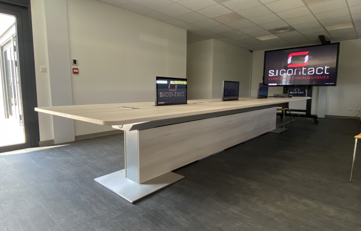 Pour réponde à cette demande, notre équipe est intervenue sur la préconisation du mobilier du système de visioconférence ainsi que sur l’affichage. Tout d’abord une table sur-mesure a été créée afin de pouvoir s’adapter à la longueur de la salle mais également pour y prévoir l’emplacement des écrans secondaires. Ces écrans motorisés double-face sont encastrés en milieu de table afin de pouvoir les faire sortir automatiquement et à volonté. Ils permettent d’avoir un retour écran du NEWLINE 85“ afin que pendant les formations notamment les participants aient une parfaite vision de ce qui est partagé dans les moindres détails. Un système de Visioconférence a également été installé pour les réunions avec des personnes à distance. Pour avoir la possibilité d’utiliser plusieurs plateformes, c’est la barre de visioconférence UVC40-BYOD de YEALINK qui a été Installé.