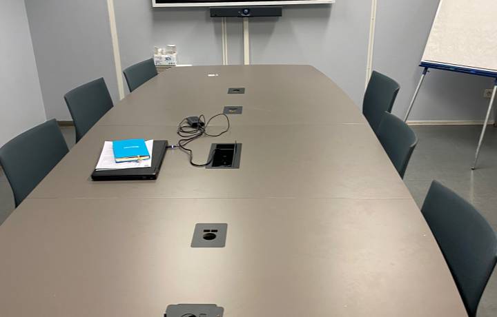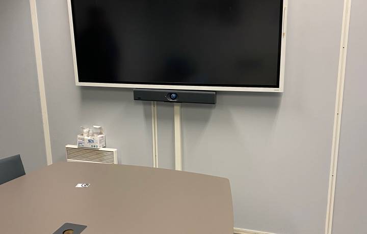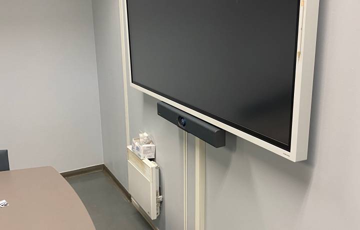 De ce fait, notre équipe est intervenue sur la préconisation des systèmes associés à cet écran ainsi que sur le mobilier conformément à leur besoin. Pour la visioconférence, le système UVC40-BYOD tout en un a été associé à l'écran tactile Flip 2 65“ de Samsung. Pour le mobilier, une table CLEN de 12 personnes avec un plateau couleur argile et des pieds gris anthracite où sont encastré des boitiers de table gris anthracite ont été installé pour bancher des appareils. Un boitier Panconnect uni a été ajouté pour compléter les possibilités de connectique avec un LAN, un HDMI, un USB-C et un USB 3.0 pour faciliter la gestion des câbles et la connection au système.