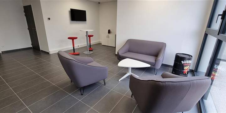 Pour ce qui est des espaces communs, nous avons préconisé du mobilier moderne et épuré en y ajoutant une touche de couleur. Un premier espace avec un canapé 2 places accompagné de 2 fauteuils ont été disposé autour d'une table basse a été créé. Le second lui est composé d'une table haute autour duquel se trouvent deux tabourets rouges. Un meuble de rangement a aussi été installé ainsi qu'un écran de 43" Samsung fixé au mur.