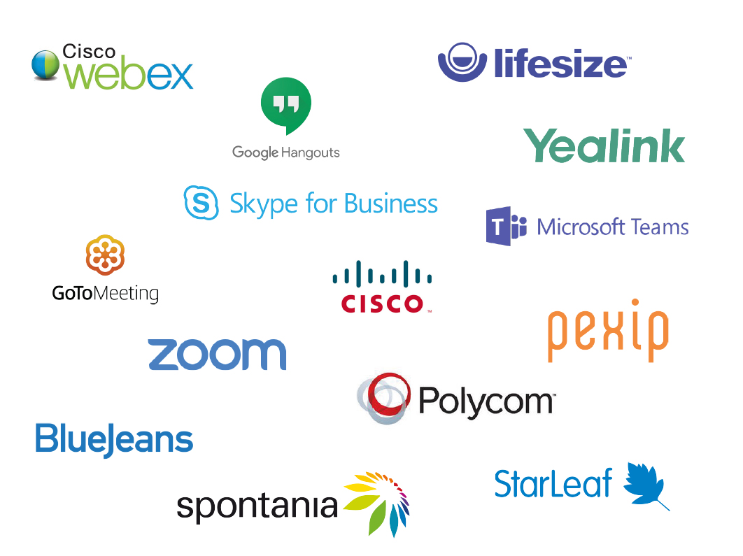 • Cisco • Google Hangouts • Starleaf • BlueJeans, Zoom • Spontania • Lifesize • Polycom • Yealink • Videxio • Pexip • GoToMeeting
