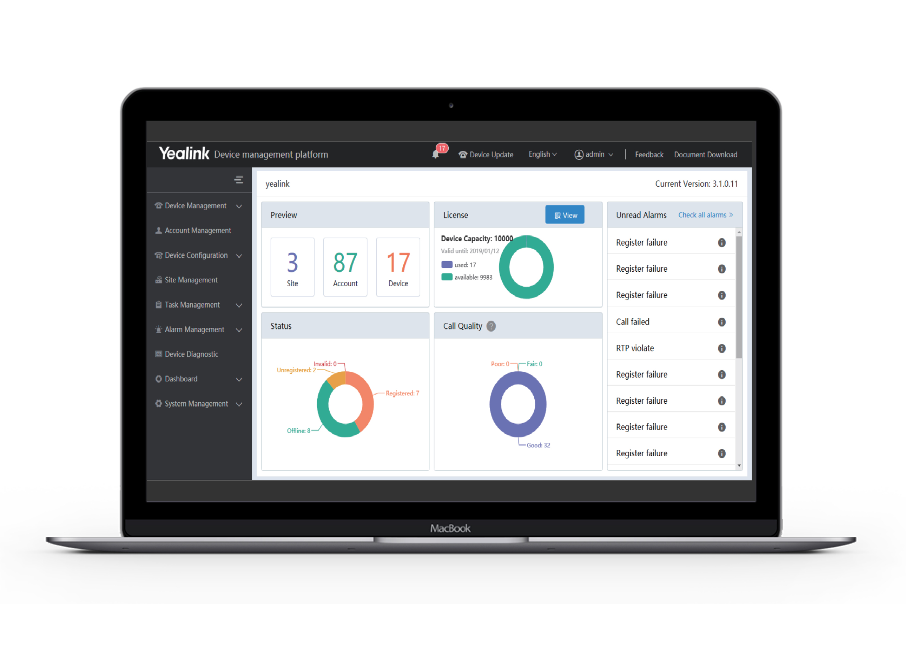 La plateforme de gestion des appareils Yealink ou le service de gestion cloud peuvent gérer les kits de salles de zoom Yealink ZVC500 et ZVC800, permettant aux administrateurs de contrôler facilement les appareils à distance. La plate-forme prend en charge la configuration à distance, la mise à niveau des microprogrammes, la surveillance et le diagnostic. Grâce à Windows Update, les utilisateurs peuvent obtenir la dernière version du pilote de la caméra UVC et du plug-in Yealink pour les salles de zoom, ce qui améliore encore l'expérience de l'utilisateur dans les salles de zoom.