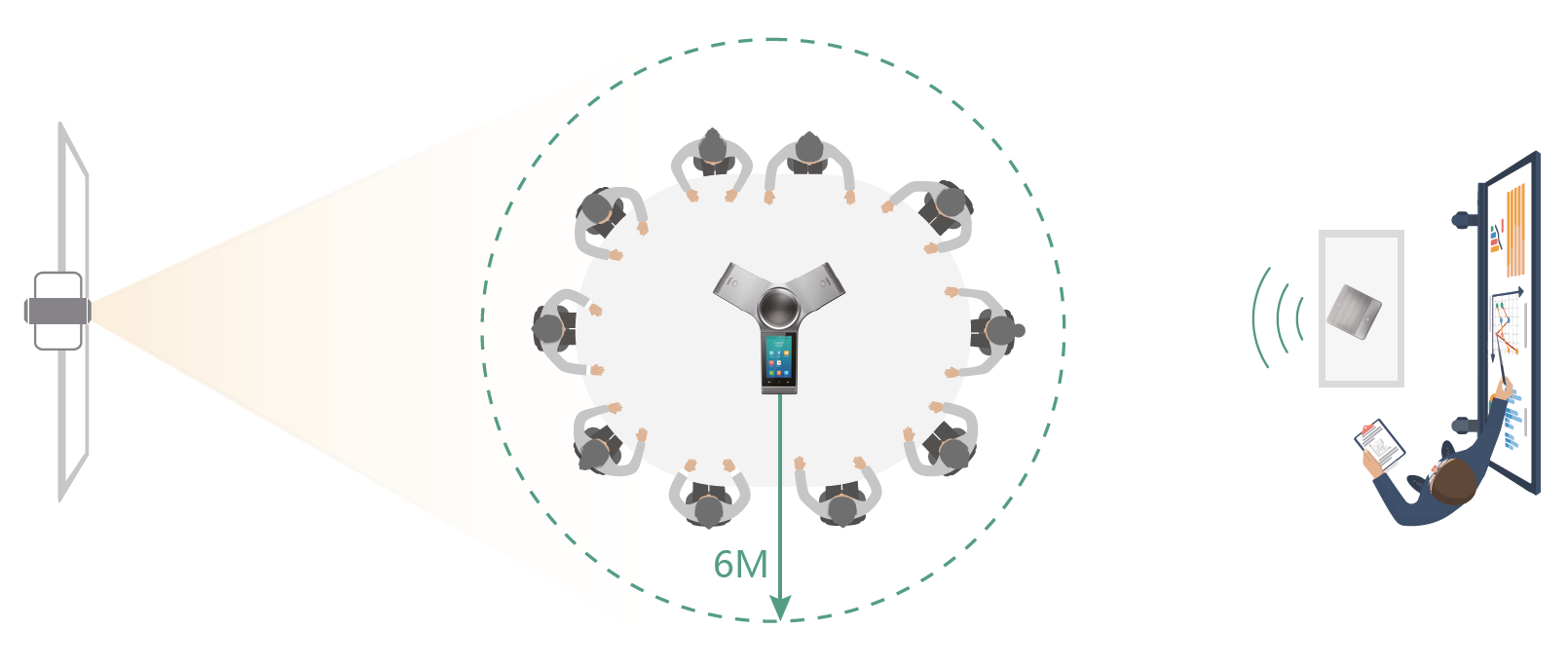 Conjugué avec le téléphone de conférence CP960 de Yealink, le Yealink VC800 vous offre une meilleure solution de conférence. Soutenu par le haut-parleur Harman-Kardon, deux microphones d'expansion sans fil basés sur DECT et la distance de prise de voix de qualité de 6m / 360 °, n'importe qui dans l'espace de travail bénéficie d'une expérience audio HD immersive.